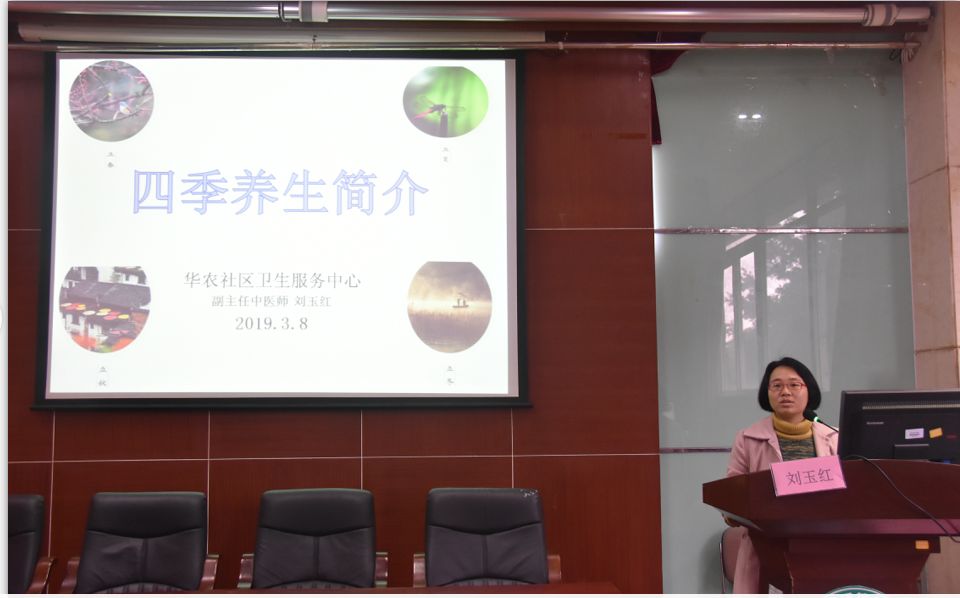 3月8日上午,为弘扬中医传统文化,普及养生知识,营造“和谐资环、幸福资环、卓越资环”,恰逢“三八“妇女节”之际,学院党委及工会联合举办中医养生专题讲座,邀请华农社区卫生服务中心副主任中医师刘玉红医生,为我院教工讲解《四季养生》知识,校医院院长范穗光、副院长童峰参及学院全体教工参加了讲座。