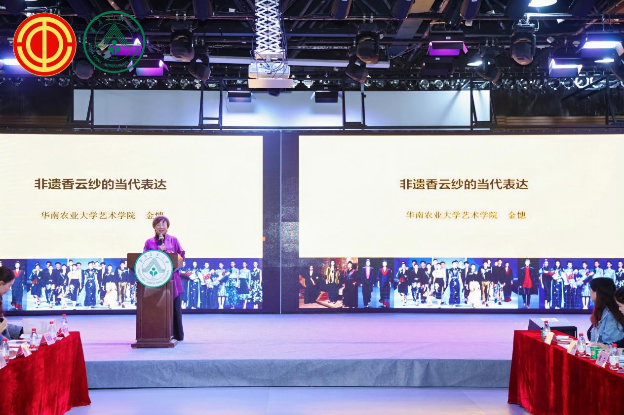 在经验分享环节,联盟领衔人、艺术学院金惠教授分享了其领衔的非物质文化创新工作室在非遗香云纱传承和创新方面的探索与成果,包括团队担任第十五届全运会制服评审及服装监制工作的宝贵经历。