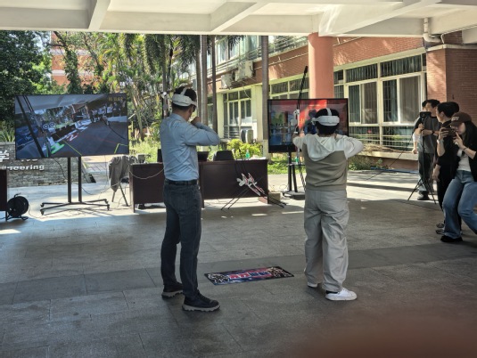 活动于下午15时正式开始,工程学院党委钱立雄书记进行了简短而热情的开场致辞。随后由专业技术人员对MR设备的操作方法及比赛规则进行了细致讲解,大家分组投入到两个别具一格的MR竞技项目中。在MR弓箭射靶赛中,参赛者佩戴MR头显,手持智能仿真弓箭,在虚拟靶场中展开精准对决。每人限时60秒,系统自动记录有效命中环数。选手们全神贯注、沉稳拉弓,每一次命中都引来阵阵喝彩,充分体现了专注力与手眼协调能力的完美结合。紧接着进行的MR躲避球2v2守擂赛将活动推向高潮。比赛采用守擂挑战制,两两组队,在10米×6米的场地内展开激烈对抗。借助MR技术,选手不仅能投掷虚拟躲避球,还能激活“护盾”、拾取“能量道具”,甚至释放“放大球”进行连击,科技感与趣味性十足。擂主轮番更替,挑战此起彼伏,现场加油声、欢笑声不断,团队协作与策略博弈贯穿始终。经过近两小时的精彩角逐,活动评选出个人优胜奖,并举行了简短而温馨的颁奖与合影环节。